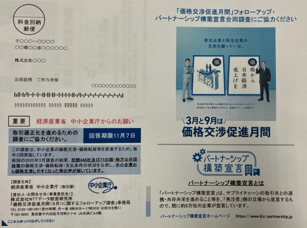 価格転嫁が実現されやすい環境を作り上げていくためには、多くの中小企業皆様からのご意見をいただき、現状を正確に把握することが重要ですので、中小企業庁から調査案内のハガキが届いた中小企業の皆様はご協力をお願いします。