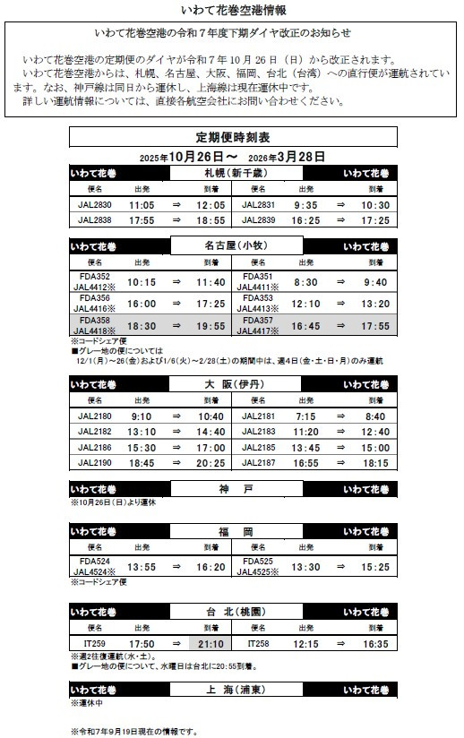 花巻空港の令和7年度下期ダイヤが以下のとおり改正されます。