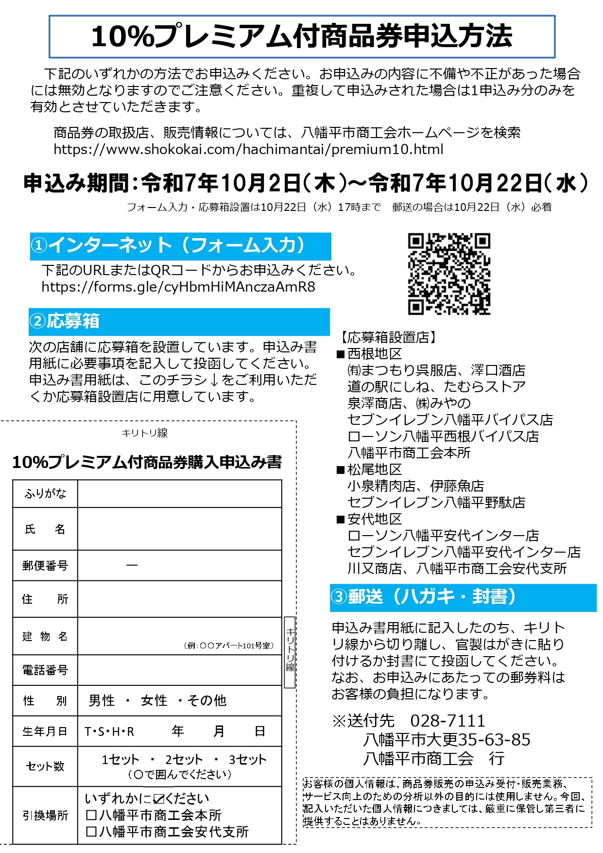 次の店舗に応募箱を設置しています。申込用紙に必要事項を記入して投函してください。申込用紙は、全戸配布のチラシまたは下記のチラシデータを印刷してご利用いただくか応募箱設置店に用意しています。