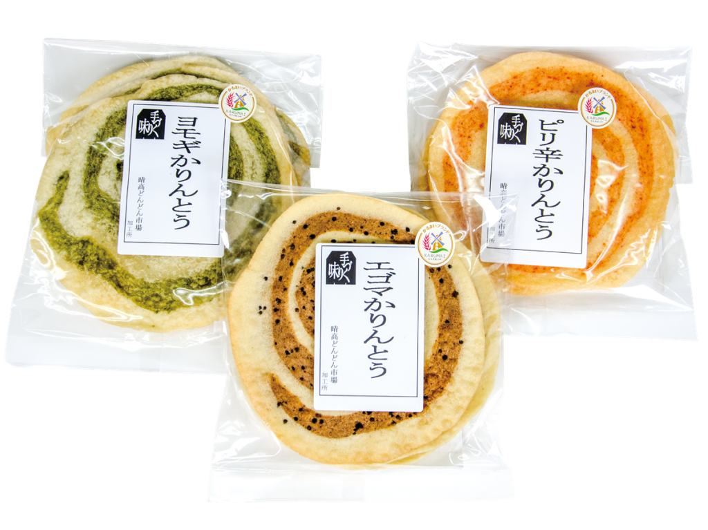 かりんとう三姉妹 甘さ控えめでいくらでも食べられ、薄いためお年寄りにも食べやすい ①エゴマかりんとう ②ピリ辛かりんとう ③ヨモギかりんとう 事業者名 晴高どんどん市場 郵便番号 〒028-6303 住所 軽米町大字高家7-54-1 電話番号 0195-46-3115