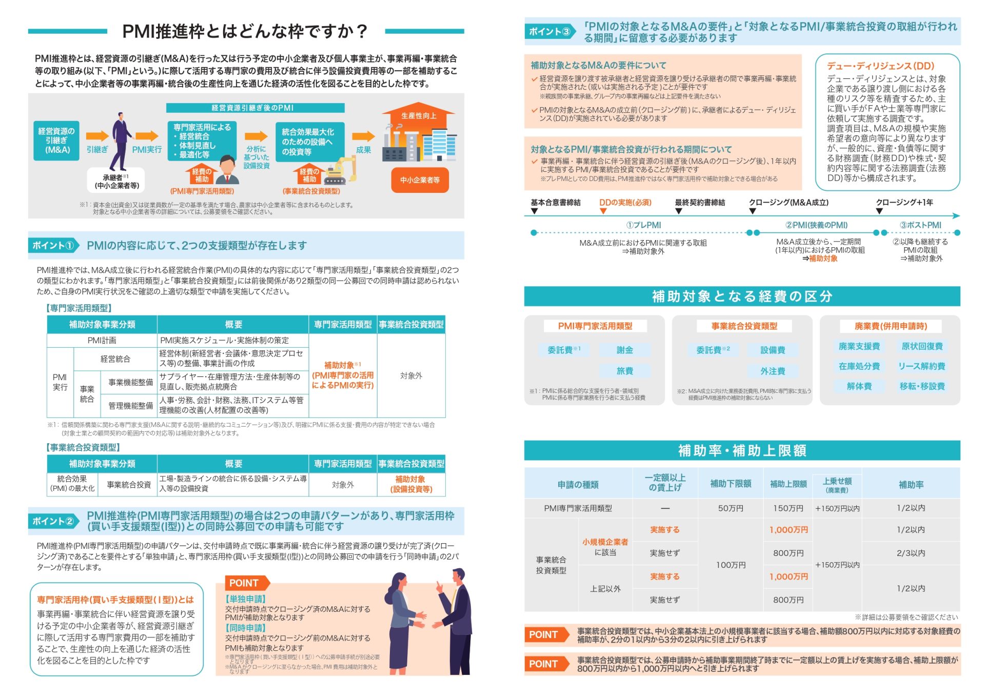 事業承継・M&A補助金は、中小企業・小規模 事 業 者 等が 、事 業 承 継やM&Aに際して行う設 備 投 資 等や、事 業 承 継・事 業 再 編 及び 事 業 統 合に伴う経 営 資 源の引継ぎ、または引継ぎ後の経営統合に係る経費の一部を補助することによって、事業承継・事業再編及び事業統合を促進し、我が国経済の活性化を図ることを目的とした補助金です。