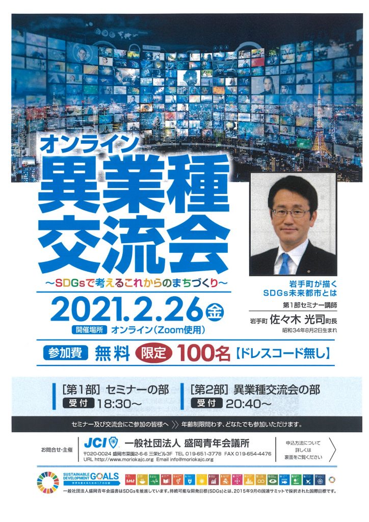 一般社団法人 盛岡青年会議所では、「SDGsで考えるこれからのまちづくり」と題して、岩手町の佐々木光司町長を講師にお迎えしてセミナーと異業種交流会を開催します。 つきましては、ご興味のあるかたは申込フォームにより直接お申込み下さい。