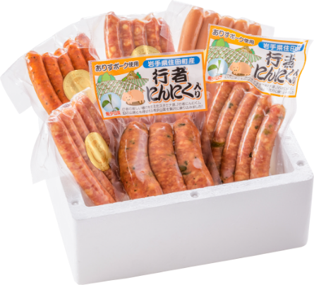 ありすポーク本来の味が楽しめるプレーン、ジューシー食感のあらびき、住田町産の山菜・行者にんにくを贅沢に練り込んだソーセージなど、こだわり6種の味わいをお届け。