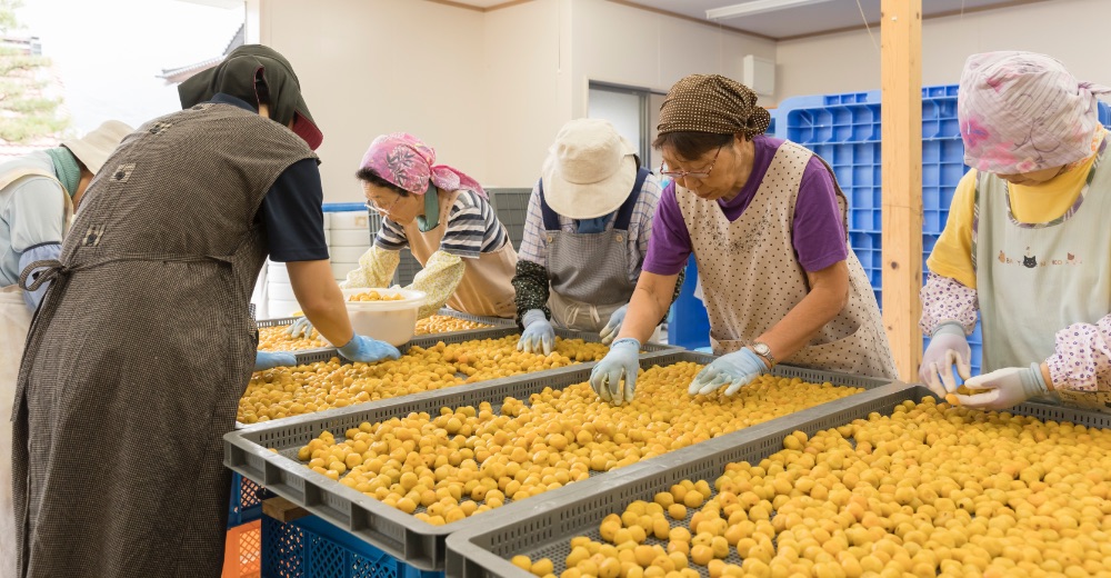 手間をかけてでも、酸っぱくてまた食べたくなる昔ながらの梅干を消費者に届けたい。それが、及川農園の思いだ。代表取締役の及川詔夫さんは、24歳の時に家業へ。母の梅干作りは幼い頃から見慣れた光景だった。母は詔夫さんが38歳の時に亡くなったが、その技法はしっかりと受け継がれている。詔夫さんと共に働くのは、平均年齢69歳の女性パートさんたち。作業場には笑顔の花が咲き、活気がある。